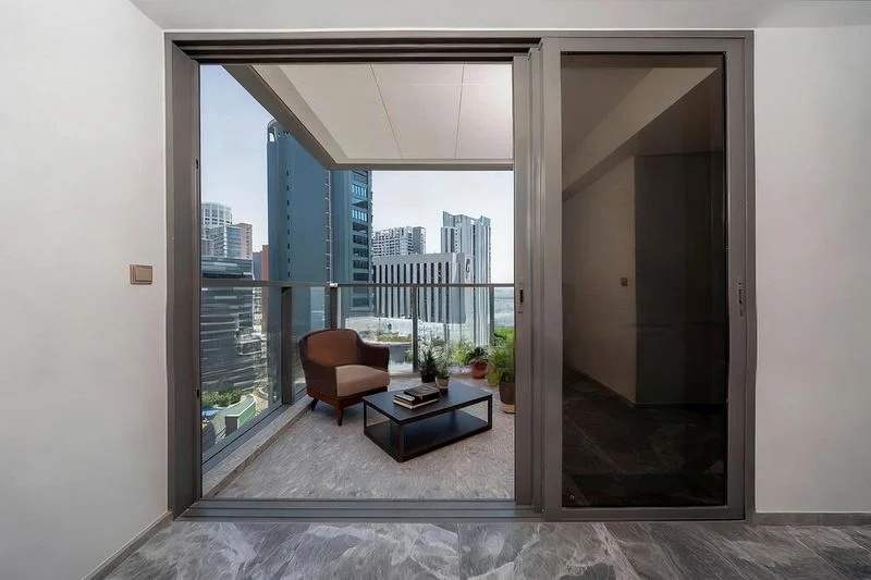 This spacious 4-bedroom unit features a well-appointed kitchen with dark marble-look countertops, dark wood cabinetry, and an internal viewing window that seamlessly connects to the living area. The living room boasts light grey tiled flooring and large sliding glass doors that lead to the balcony, perfect for entertaining. Each bedroom is designed for comfort, showcasing wood-look laminate flooring and large windows that frame stunning city views. The bathrooms are finished with marble-look wall tiles, modern vanities, and glass shower partitions, adding a touch of luxury to your daily routine.