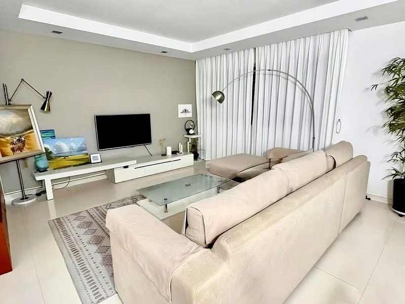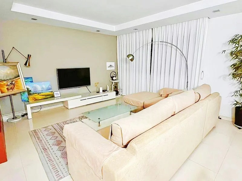 Step into this inviting 3-bedroom flat and feel the warmth of its cozy ambiance. The living room greets you with a large built-in wooden TV console, complemented by recessed lighting and a charming orange ceiling border trim. Natural light filters through, creating a welcoming atmosphere that makes you feel right at home.