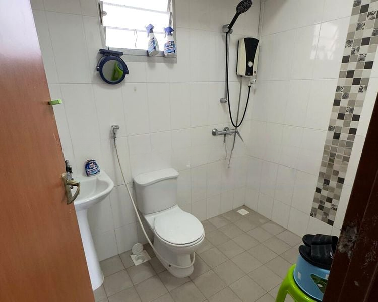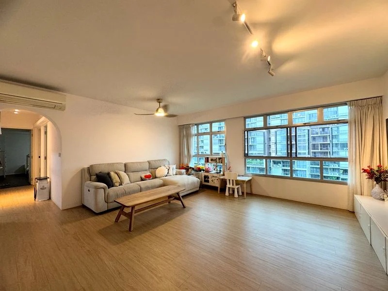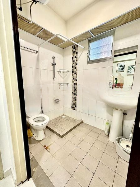 This well-maintained 5-room flat features three spacious bedrooms, including a master bedroom with ample room for a treadmill and a dedicated study area with dual workstations. The galley kitchen is a chef's dream, equipped with white minimalist cabinetry, an induction hob, and integrated laundry facilities. Bathrooms showcase designer tiles, vessel sinks, and rain showers, adding a touch of luxury to everyday living.