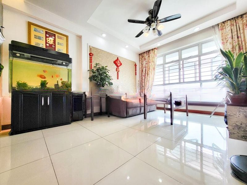 Step into a haven of modern minimalism at this beautifully renovated HDB flat, where natural light dances across the open spaces, highlighting the designer finishes and serene greenery views. The ambiance is inviting, with wood-look wall tiles and a soothing palette that creates a tranquil retreat from the bustling city.