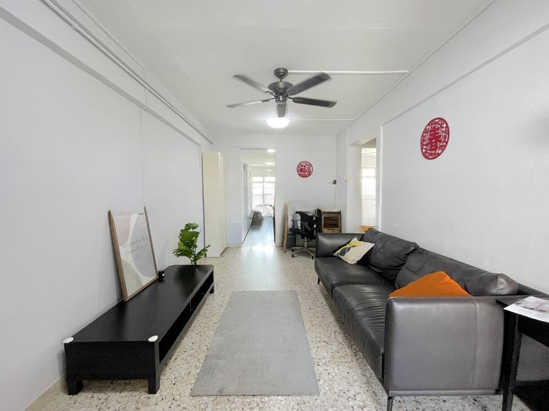 Step into a homely retreat where vintage patterned floor tiles greet you at the entrance, setting a warm and inviting tone. The living room, adorned with a false ceiling and recessed lighting, offers a cozy ambiance complemented by an unblocked high-floor view of the urban landscape. Natural light filters through the windows, enhancing the space's welcoming feel.