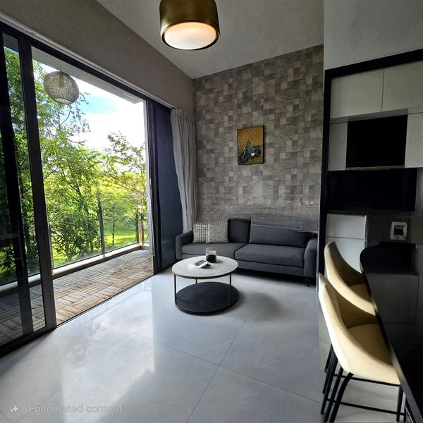 Step into a bright and airy sanctuary at The Cape, where abundant natural light floods the space through large sliding doors, illuminating the high ceilings and the stunning textured feature wall. The seamless blend of indoor and outdoor living is accentuated by the inviting balcony with wooden decking, offering a perfect spot to unwind while enjoying views of the greenery and city skyline.
