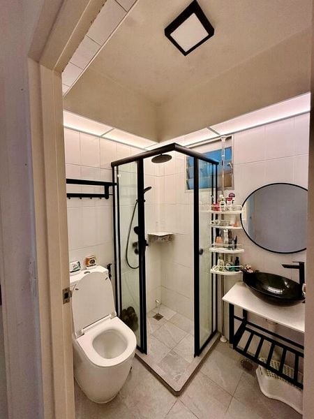 This well-maintained unit features two spacious bedrooms, including a versatile bedroom/study adorned with a beach-themed mural, perfect for relaxation or productivity. The bathrooms are a standout with their unique finishes, including a black-framed glass shower enclosure and elegant vessel sinks. Thoughtful touches like under-bed storage drawers and consistent wood-look flooring enhance the functionality and aesthetic appeal of this charming flat.