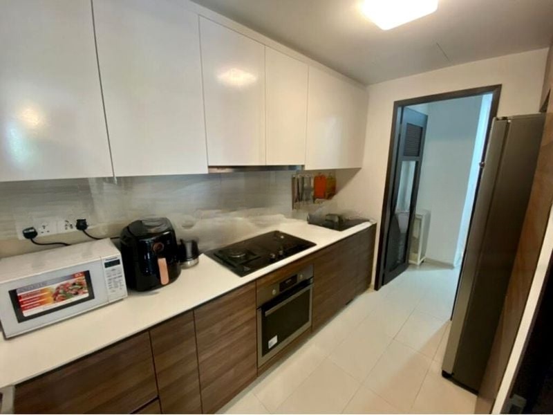 This well-maintained unit features a contemporary galley kitchen equipped with a built-in oven, gas hob, and solid surface countertops, ideal for culinary enthusiasts. The bathrooms boast chic marble-look tiles and modern vanities, while the bedrooms provide comfort with wood-look laminate flooring and ceiling fans. A versatile study area adds to the functionality of this 3-bedroom layout, making it perfect for families or professionals.