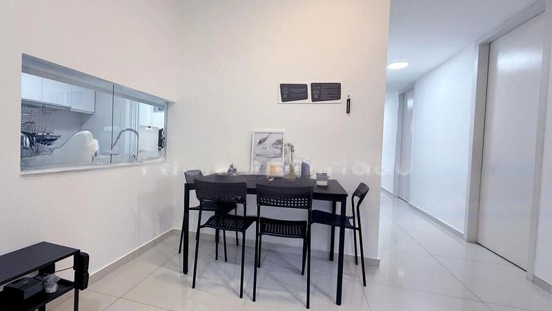 Step into a beautifully renovated 1-bedroom unit at Bedok Residences, where modern elegance meets functional living. The inviting ambiance is enhanced by moderate natural light filtering through sliding doors, leading you to a private balcony with views of the city skyline and surrounding residential landscape. The travertine-style bathroom tiles and glass shower partition create a spa-like retreat, while the contemporary finishes throughout the unit exude sophistication.
