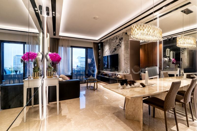 This well-maintained 3-bedroom, 3-bathroom unit features an open-plan layout, perfect for entertaining. The kitchen boasts dual-tone cabinetry and a striking mirror backsplash, complemented by integrated appliances including a built-in oven and gas cooktop. Relax in the spacious living area or step out onto the private balcony, equipped with an outdoor dining set, where you can enjoy the urban landscape in style. The bathrooms are equally impressive, featuring dark grey stone-look tiles and modern fixtures.