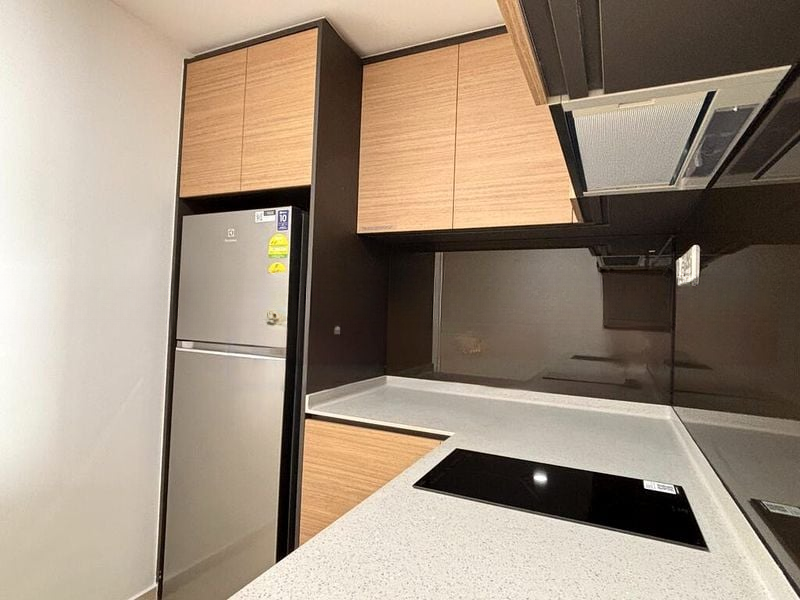 This well-maintained unit features a thoughtfully designed layout, including a fully-equipped kitchen with integrated appliances and a space-saving fold-down dining table. The bathroom is a true highlight, boasting full-height marble-look tiles, a rain shower, and a sleek modern vanity. The bedroom, with its warm wood-look flooring and upholstered headboard, provides a cozy retreat, complemented by ample storage solutions throughout.