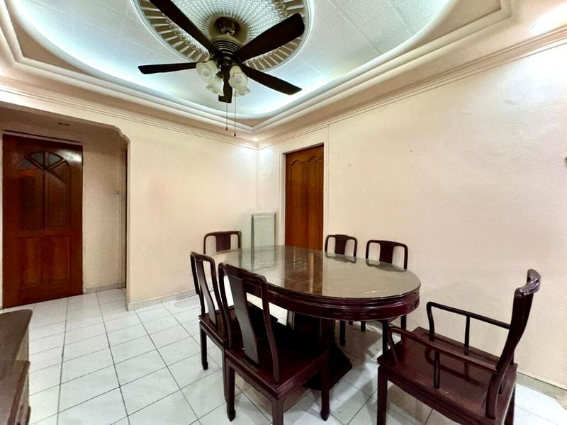 Step into this inviting 4-bedroom HDB flat, where the charm of original finishes meets functional living. The recessed ceilings with cove lighting create a warm ambiance, complemented by moderate natural light filtering through the sliding glass doors that lead to a balcony. The living room, adorned with a dark leather sofa set, exudes comfort, while the dining area invites gatherings under the soft glow of integrated ceiling lights.