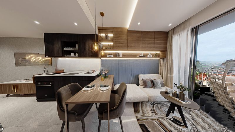 Step into a world of modern elegance as you enter this brand-new designer unit at GEMS VILLE. Bathed in abundant natural light, the open-concept living area features exquisite marble-look flooring and floor-to-ceiling windows that frame breathtaking views of the city skyline and lush greenery. The contemporary ambiance is enhanced by designer lighting and chic furnishings, creating a warm yet sophisticated atmosphere.