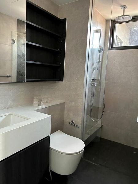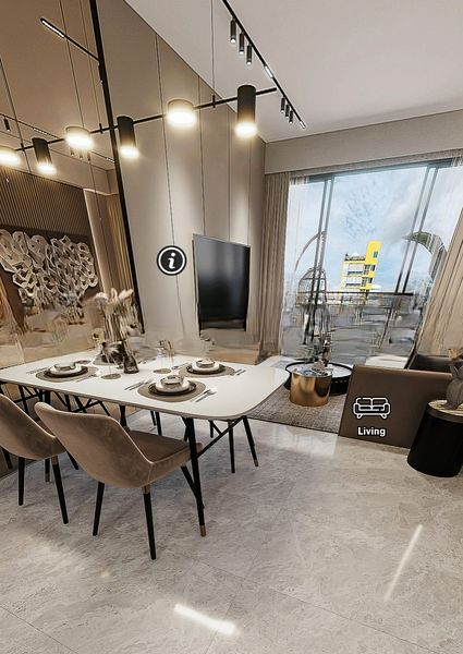 This thoughtfully designed 2-bedroom, 2-bathroom unit boasts standout features including a spacious living room adorned with botanical wall art, a dining area with modern track lighting, and a master bedroom that showcases a stunning 3D textured feature wall. Enjoy the luxury of an infinity pool and a poolside gym with glass walls, all set amidst beautifully landscaped surroundings.