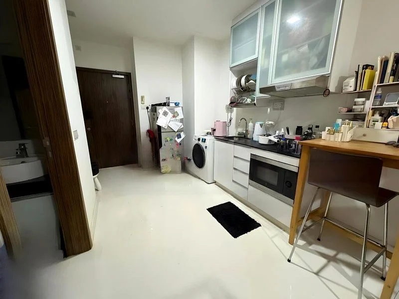 Step into a warm and inviting ambiance where natural light dances across the open-concept living area, highlighting the elegant white tiled flooring and stylish furnishings. The cozy living room, complete with a TV console and wine rack, seamlessly flows into the kitchenette, which boasts modern white cabinetry and sleek grey countertops. Enjoy serene views of the pool and lush greenery from the spacious private enclosed space (PES), perfect for relaxation or entertaining.