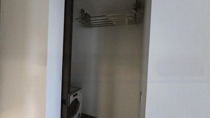 Step into a brand-new, modern minimalist haven where natural light dances across the grey tiled flooring and white walls of the open-plan living area. The floor-to-ceiling windows frame breathtaking views of the city skyline, creating an inviting ambiance that feels both spacious and intimate.