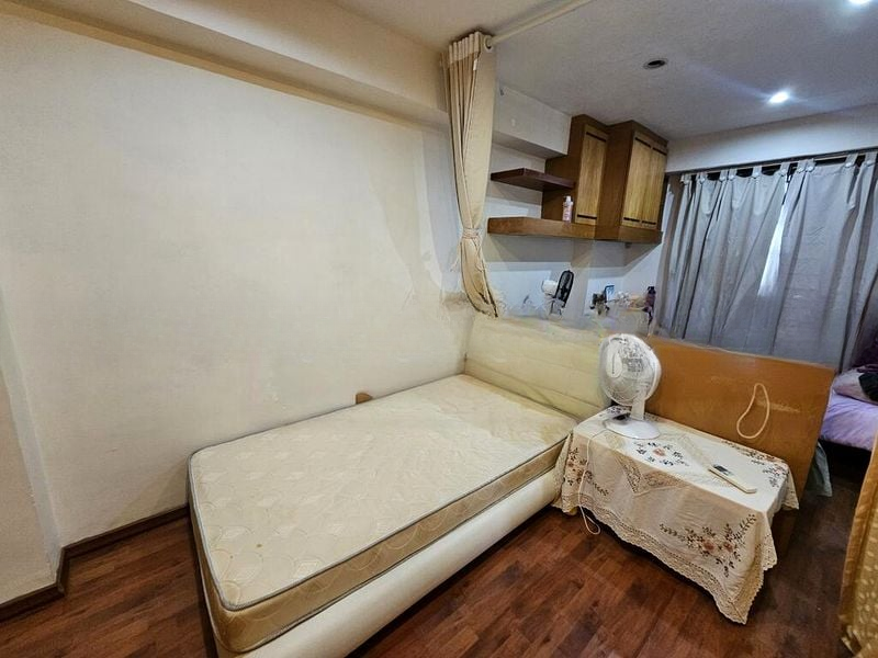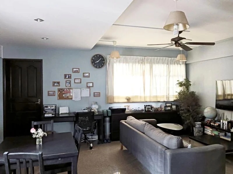 Step into a cozy sanctuary where urban greenery meets homely charm. This well-loved flat greets you with moderate natural light filtering through the windows, illuminating the wood-look flooring and highlighting the thoughtful finishes throughout. The living room features a built-in wooden TV console and a stylish wooden screen divider, creating a warm ambiance perfect for relaxation.