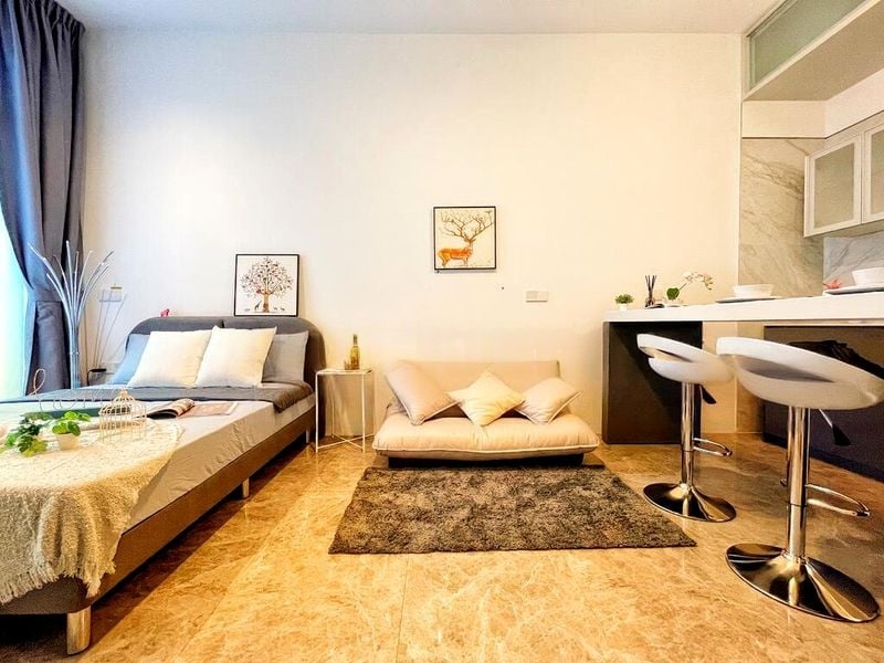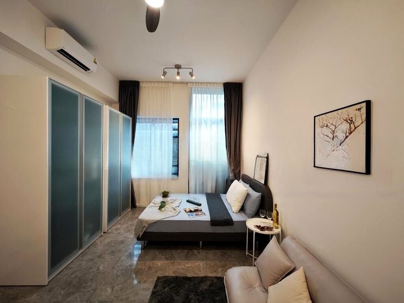 Step into a world of modern elegance as you enter this brand-new designer unit at THE M. Bathed in abundant natural light, the living area features sleek marble-look floor tiles and modern pendant lighting, seamlessly connecting to a private balcony that offers breathtaking views of the pool and city skyline. The minimalist ambiance invites you to relax and unwind in style.