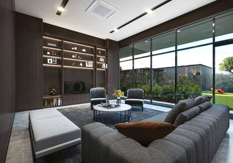 This spacious 3-bedroom unit features a well-thought-out layout, highlighted by a stylish living room adorned with dark wood built-in shelving and integrated LED strip lighting. The marble-top coffee table and designer furniture elevate the space, while the recreation room offers a pool table and electronic dart machine for endless fun. With multiple swimming pools, including an Olympic-sized lap pool and children's pool with a slide, this residence is designed for both leisure and family enjoyment.