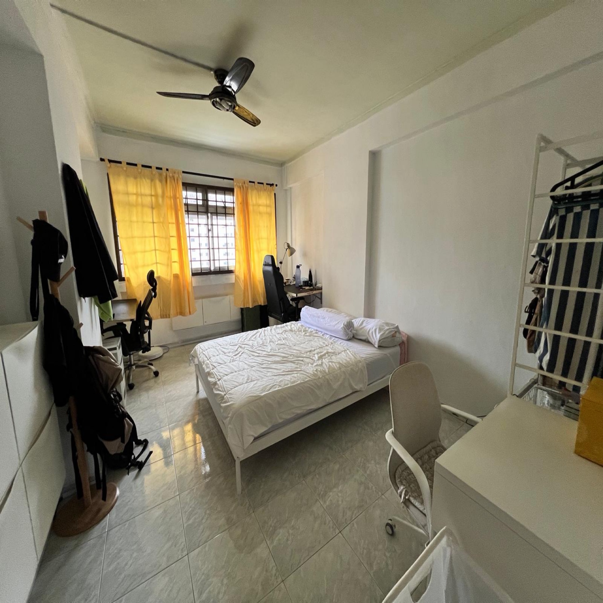 Step into this inviting 1-bedroom flat where the city skyline greets you through the windows, filling the space with a sense of vibrancy. The light-colored tiled flooring and white curtains create a bright and airy ambiance, while the functional layout ensures every corner is utilized effectively. The ceiling fans add a touch of comfort, making it a perfect retreat after a long day.