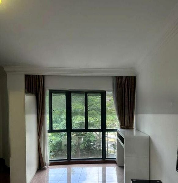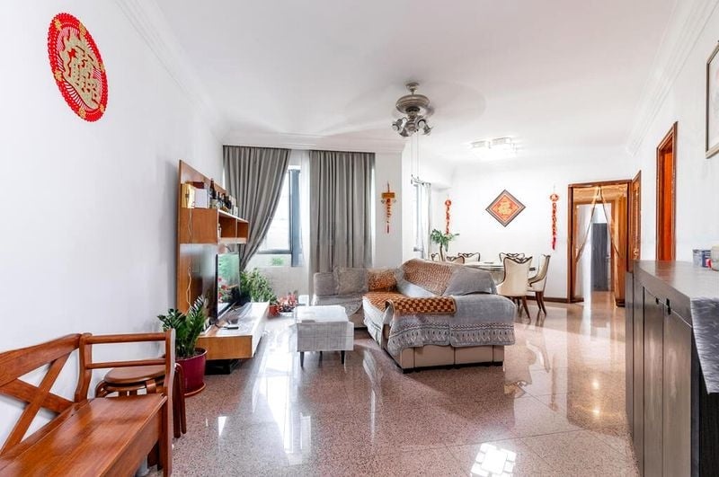 Step into a warm and inviting atmosphere where abundant natural light floods through large windows, illuminating the polished stone flooring and enhancing the cozy ambiance of this well-maintained unit. The traditional decor, complemented by a round marble dining table and ornate high-back chairs, creates a charming dining experience, while the views of lush greenery and neighboring residential blocks offer a serene backdrop.