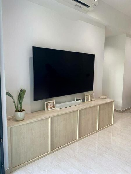 Step into a sanctuary of modern minimalism where abundant natural light floods the space, highlighting the sleek finishes and thoughtful design. The open-concept living area features light-colored floor tiles and a wall-mounted TV, complemented by a long wooden console with under-cabinet LED lighting, creating an inviting ambiance. The balcony offers a serene view of lush greenery, seamlessly blending indoor and outdoor living.