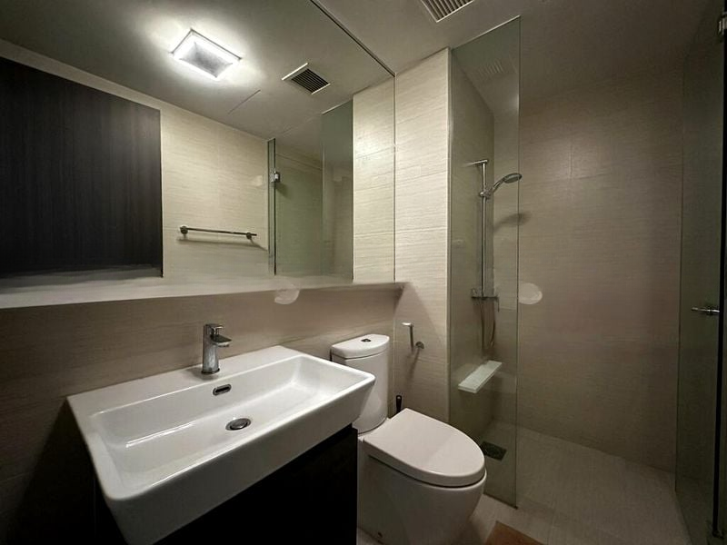 This efficient layout features standout rooms, including a master bedroom with a built-in wardrobe and a large window framing the vibrant cityscape. The second bedroom is equipped with built-in overhead storage and a wall-mounted TV, ensuring functionality without compromising style. Enjoy the convenience of modern finishes such as track lighting, an induction hob, and under-cabinet lighting in the kitchen, all designed for contemporary living.