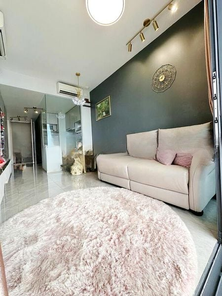 Step into a bright and airy sanctuary at The Garden Residences, where abundant natural light dances across the marble-look floor tiles, creating an inviting ambiance. The large windows frame picturesque views of the lush landscaped garden and ornamental pond, instantly making you feel at home in this serene environment.