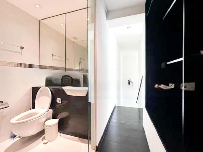 This well-maintained unit features an open-concept layout that seamlessly integrates the living and kitchen areas. The kitchen is equipped with integrated designer appliances, including a coffee machine and a breakfast bar perfect for casual dining. The living room boasts a stylish black leather sofa and track lighting, leading up to the loft bedroom that offers a peaceful retreat with large windows and a ceiling fan. The monochrome bathroom showcases a walk-in shower and modern fixtures, completing this sophisticated living experience.