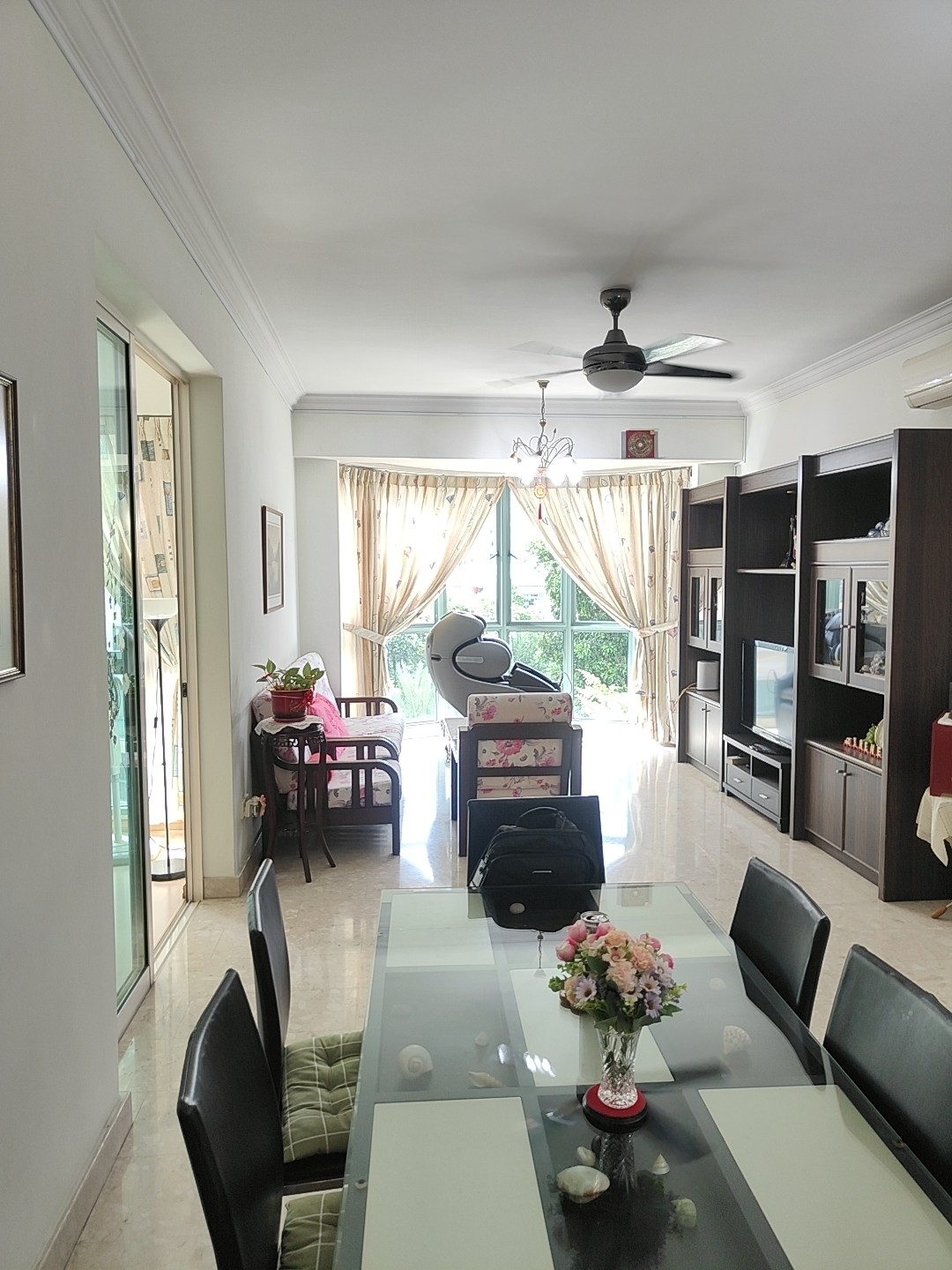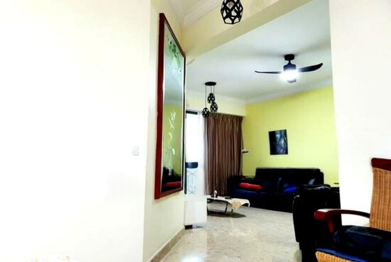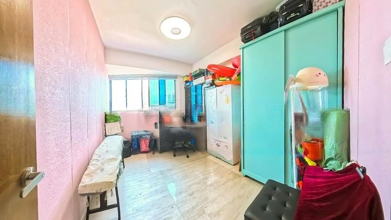 Step into this inviting unit at Yew Mei Green, where a cozy ambiance greets you with moderate natural light filtering through large windows. The living room features a striking yellow accent wall and elegant marble-look tiled flooring, complemented by stylish pendant lighting and comfortable dark leather sofas. The spacious balcony offers an urban view, perfect for unwinding after a long day.