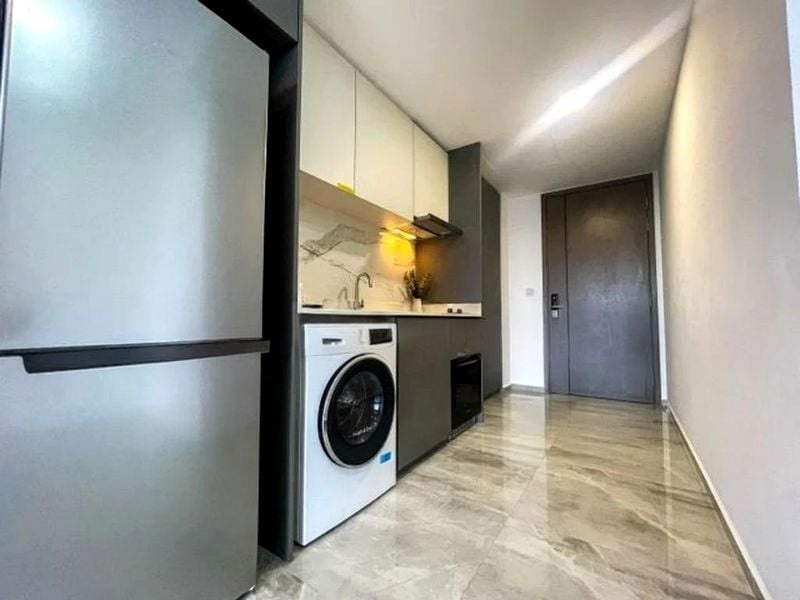 Step into a bright and airy sanctuary where abundant natural light floods the space, accentuating the elegant marble-look floor tiles. The open-concept living area seamlessly connects to a balcony that offers unobstructed views of the pool and lush greenery, creating a tranquil retreat in the heart of the city.