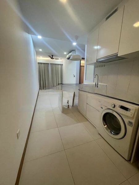 This well-maintained 2-bedroom unit features an open concept layout that seamlessly connects the living, dining, and kitchen areas. The living room boasts a wall-mounted TV and a stylish wooden console, while the kitchen is a chef's delight with its white glossy cabinetry, integrated washing machine, and sleek black granite-look countertop. The dining area, adjacent to the mural, creates an intimate setting for meals.