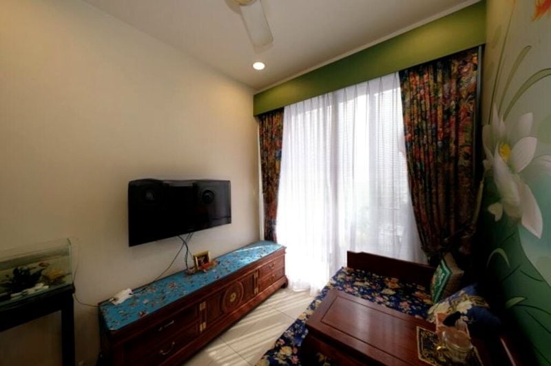 Step into a warm and inviting space where a captivating lotus wall mural greets you, setting a serene tone for the entire unit. The cozy ambiance is enhanced by moderate natural light filtering through, highlighting the elegant finishes and thoughtful design elements such as the wooden lattice screen divider and an oriental-style daybed adorned with floral upholstery.