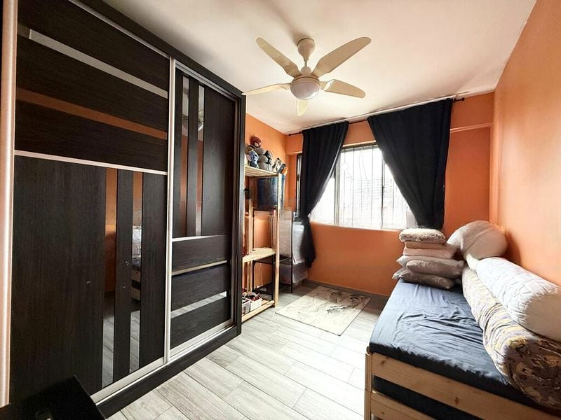 This efficient 4-room point block layout boasts three spacious bedrooms, each thoughtfully designed for comfort and functionality. The main bedroom includes a built-in sliding wardrobe and a study nook, while the second bedroom offers modular storage units for a playful study area. The galley kitchen is equipped with a built-in oven and gas hob, complemented by a dedicated service yard for added convenience.