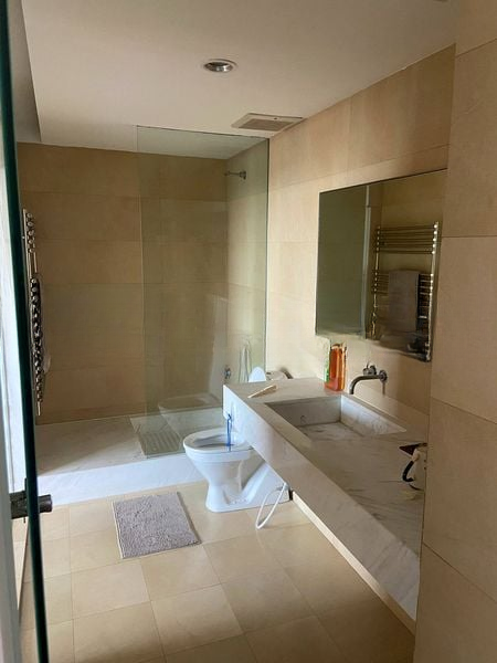 This spacious 3-bedroom, 2-bathroom unit boasts a thoughtful layout, featuring a large built-in wooden sliding wardrobe in the master bedroom and a luxurious bathroom equipped with a modern vessel sink and walk-in glass shower. The enclosed balcony, designed as a study, offers stunning views and a perfect workspace, while the recessed lighting throughout enhances the minimalist aesthetic.