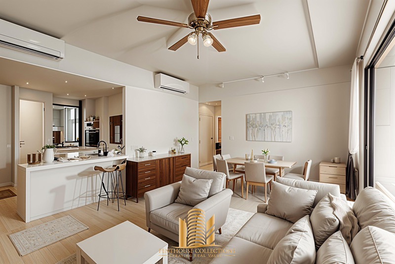Step into a modern minimalist haven where natural light dances across the spacious living area, highlighting the sleek finishes and designer touches throughout. The large feature wall with integrated display lighting creates an inviting ambiance, while the balcony with wooden decking offers a serene view of lush greenery and the lap pool, perfect for relaxation.