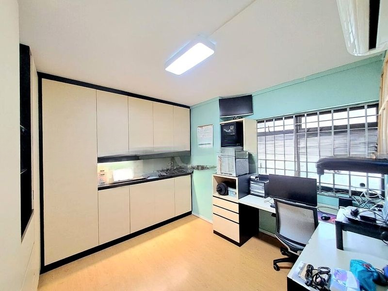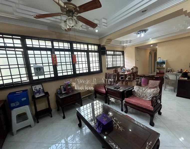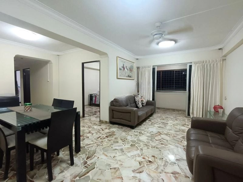Step into this inviting 4-bedroom flat at 50 Lor 5 Toa Payoh, where classic terrazzo flooring greets you, creating a warm and homely ambiance. The open-concept living and dining area is bathed in natural light, accentuated by a ceiling fan that adds to the comfort of the space. The leather sofa set invites relaxation, making it the perfect spot for family gatherings.