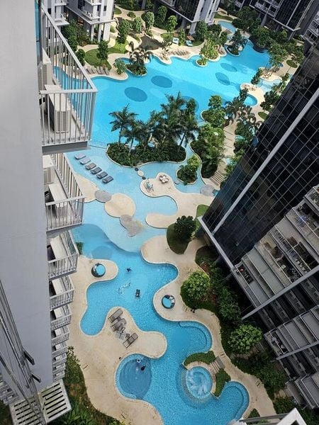 Step into a world of modern elegance as you enter this beautifully renovated unit at The Florence Residences. The open-concept living area is awash with natural light, showcasing bold purple accent walls and sleek linear ceiling lights that create an inviting ambiance. Enjoy stunning views of the winding swimming pool and lush greenery from your private balcony, making every moment feel like a retreat.