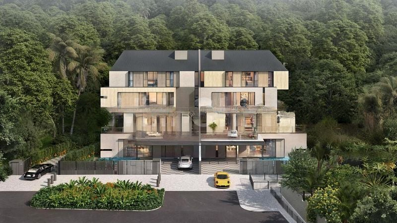 Step into a world of modern luxury as you enter this brand-new semi-detached home at Swiss Club Park. Bathed in abundant natural light, the open-concept living and dining area features stunning white marble-look floor tiles and designer pendant lighting, creating an inviting ambiance. Floor-to-ceiling glass sliding doors seamlessly connect the indoor space to a private lap pool and landscaped garden, framed by lush greenery and a serene hillside forest.