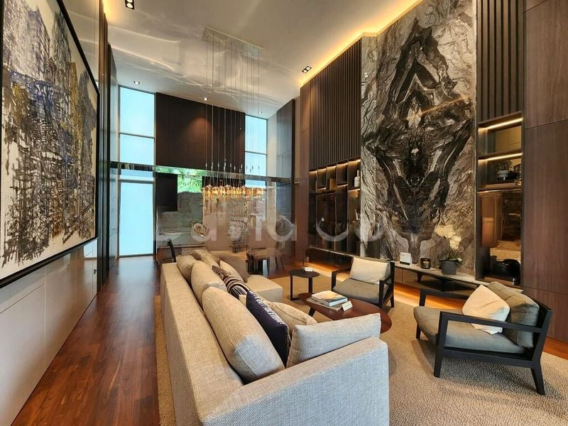 Step into a world of modern luxury as you enter this stunning unit at The Oliv. The abundant natural light floods through the floor-to-ceiling windows, illuminating the exquisite book-matched marble feature wall and highlighting the double-volume ceiling that creates an expansive ambiance. The open concept living area, adorned with large-scale wall art, invites you to relax and enjoy the breathtaking views of lush greenery and city buildings.