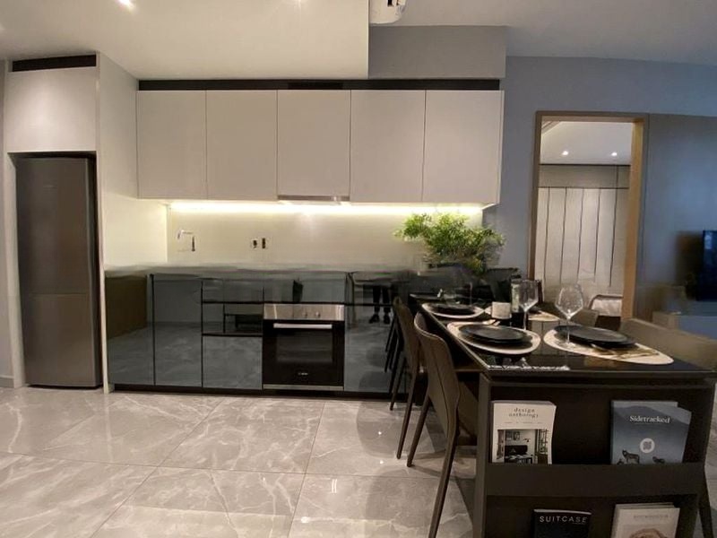 Step into a world of elegance as you enter this brand-new designer unit at The Essence. Bathed in abundant natural light, the open-concept living room features floor-to-ceiling windows that frame serene views of lush greenery and the inviting 40m lap pool. The modern minimalist ambiance is accentuated by a striking designer chandelier, creating a perfect blend of style and comfort.