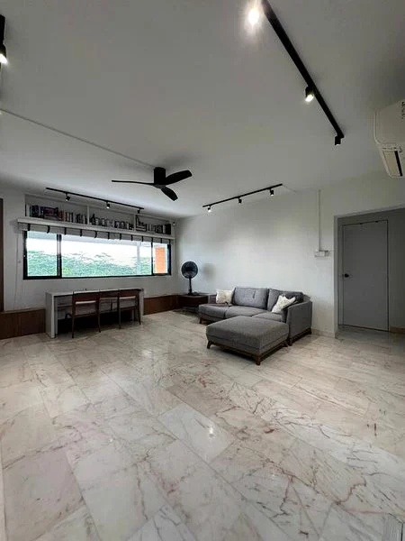 Step into this beautifully renovated HDB flat, where abundant natural light floods through large windows, creating a bright and airy ambiance. The designer finishes are immediately noticeable, from the elegant beaded chandelier to the stunning four-poster bed draped in soft linens. The views of lush greenery provide a serene backdrop, making this space feel like a tranquil retreat.