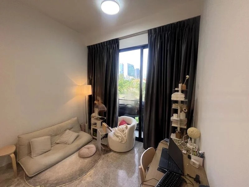 Step into a world of modern elegance as you enter this beautifully designed studio unit at 35 Gilstead. Bathed in natural light from the floor-to-ceiling windows, the space exudes a minimalist ambiance, showcasing stunning views of the city skyline and lush greenery. The marble-look flooring adds a touch of sophistication, while the dark blackout curtains offer privacy when needed.