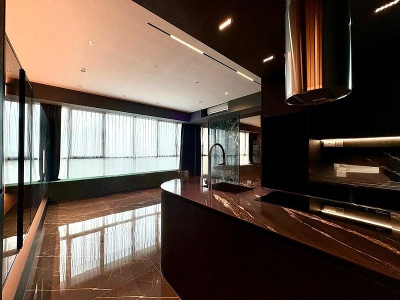 This 2-bedroom, 2-bathroom unit boasts standout features including a stylish kitchen island with dark cabinetry, a cylindrical range hood, and a dining area that seamlessly integrates with the living space. The master bedroom offers a platform bed and glass-fronted wardrobes with internal lighting, while the bathroom showcases dark marble-look tiles and a sleek glass shower partition, epitomizing elegance and functionality.