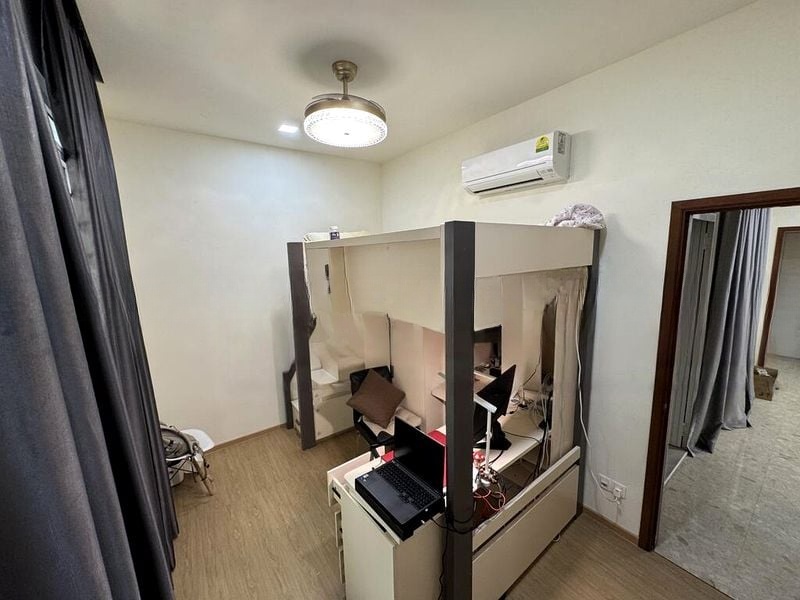 This thoughtfully designed layout includes three comfortable bedrooms, each equipped with ceiling fans and wood-look flooring for a warm touch. The standout loft bed in the first bedroom integrates a workspace, perfect for productivity, while the second bedroom offers a dual-monitor setup by a large window. The bathrooms are a testament to quality, boasting large marble-look vanities and ample storage.