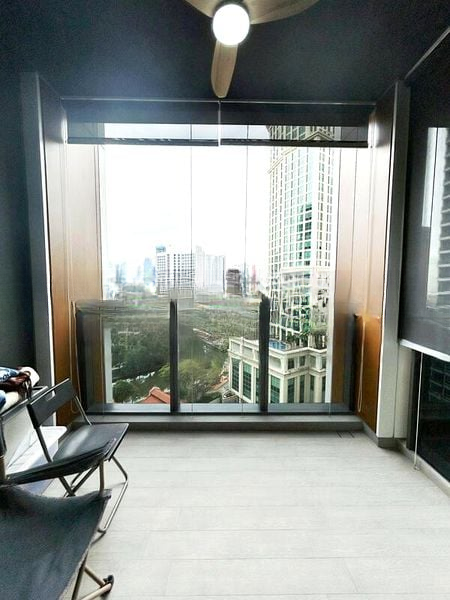 Step into a realm of modern luxury where abundant natural light floods the space, accentuating the polished marble flooring and stunning city skyline views. The designer finishes create an ambiance of sophistication, while the floor-to-ceiling windows invite the outside in, offering a breathtaking backdrop of greenery and the river.