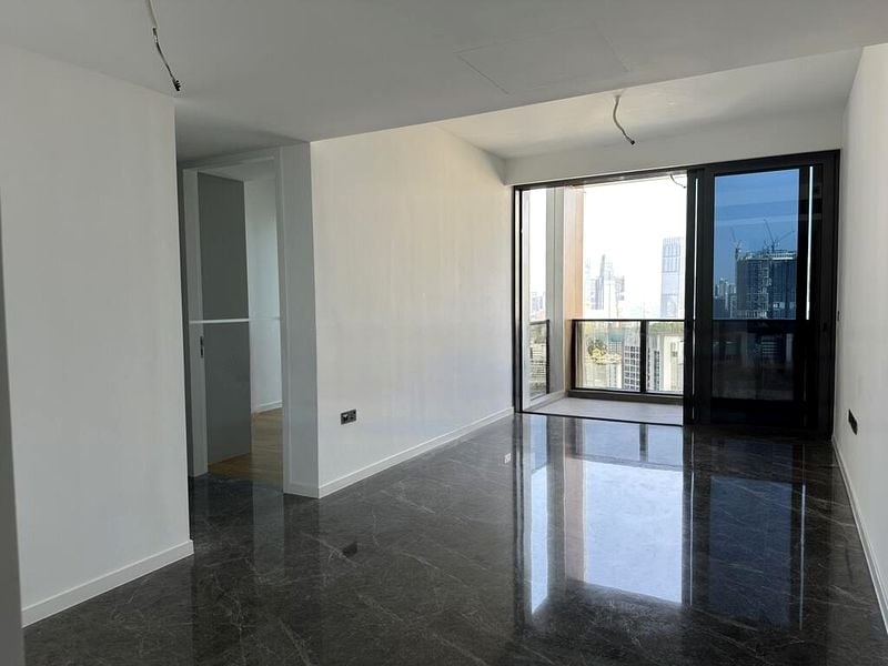 This exquisite 4-bedroom unit features an open-concept layout that seamlessly connects the living and dining areas, highlighted by a large marble feature wall and designer geometric pendant lights. The kitchen is a chef's dream, boasting a dark marble island, sleek handleless cabinetry, and integrated appliances. Each bedroom offers direct balcony access, while the bathrooms are adorned with double sink vanities and full marble tiling, ensuring a spa-like experience at home.