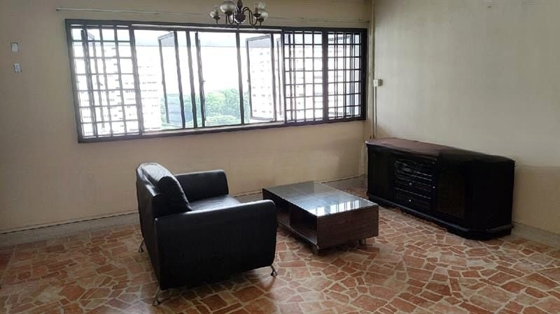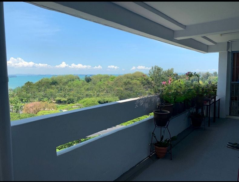 Step into a spacious 1970s HDB flat where vintage charm meets functional living. The distinctive crazy paving tile flooring greets you, leading your gaze through large windows that frame breathtaking views of the sea, ships at sea, and the urban skyline. Natural light filters in, creating a warm ambiance that invites relaxation and comfort.
