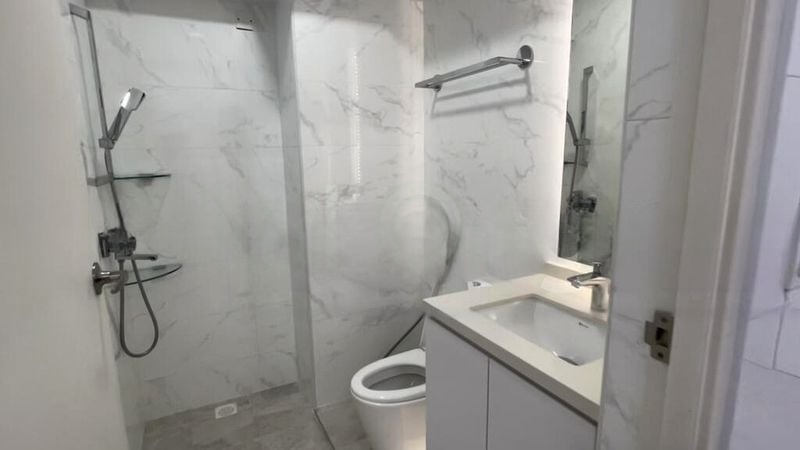This well-maintained unit features an open-concept layout that seamlessly integrates the living and dining areas, perfect for entertaining. The living room boasts a stylish blue fabric sofa and a wall-mounted TV, while the dining area is anchored by a wooden table with bench seating. The two bedrooms are designed for comfort, featuring dark wood-textured sliding wardrobes and ceiling fans with integrated lighting. The bathrooms are modern, with glass shower partitions and sleek finishes, ensuring a luxurious experience.