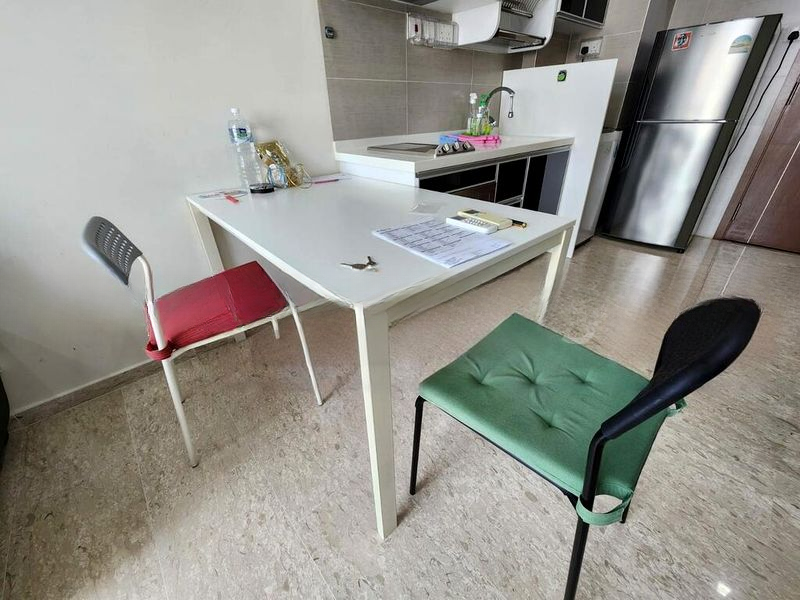 Step into this beautifully maintained 2-bedroom unit at Cardiff Residence, where abundant natural light floods the space, creating a bright and airy ambiance. The polished stone-look flooring in the living area complements the dark wood parquet flooring in the bedroom, while full-height curtains frame the large windows, offering serene views of the surrounding greenery.