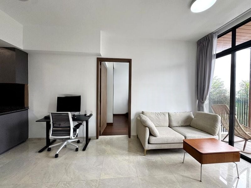 Step into a sanctuary of modern elegance at Daintree Residence, where abundant natural light floods the open-concept living space, highlighting the exquisite marble-look floor tiles and sleek finishes. The large balcony, adorned with wood-look ceiling and sliding privacy screens, offers a serene view of lush greenery, creating a tranquil ambiance that invites relaxation.