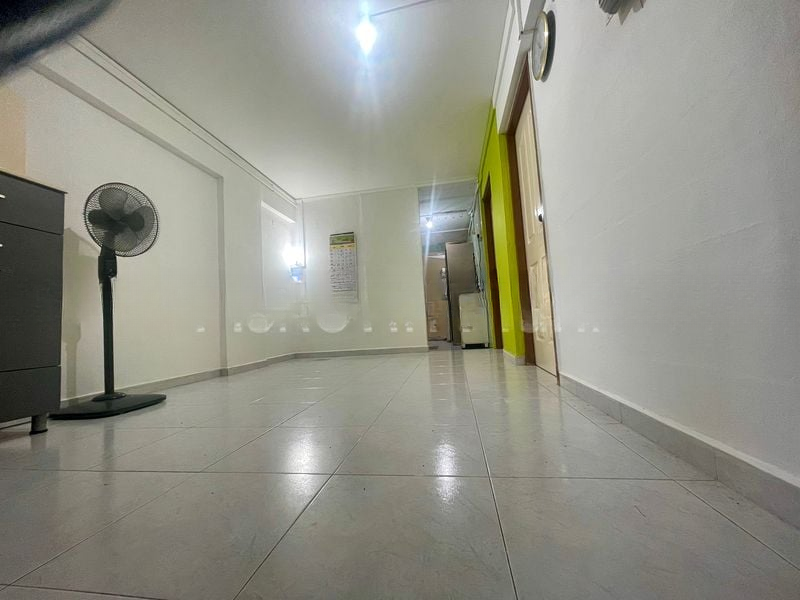 Step into this charming HDB flat and feel the warmth of its functional ambiance, accentuated by a long rectangular living room adorned with a vibrant lime green accent wall. Natural light filters through the windows, casting a gentle glow on the tiled flooring, while views of lush greenery provide a serene backdrop to your daily life.