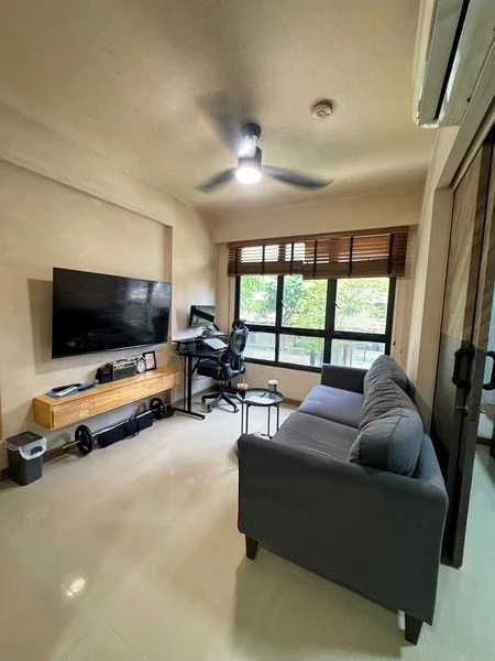 This efficient 2-room Flexi layout features a separate galley kitchen with chic black lower cabinets and a light wood-look countertop, ideal for culinary enthusiasts. The compact study nook is perfect for remote work or study, while the bedroom boasts a dark wood bed frame and full-height curtains for added privacy. With a household shelter providing extra storage and a bathroom equipped with modern amenities, this unit is designed for practicality and comfort.