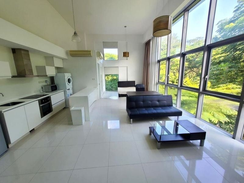 Step into this brand-new, modern minimalist unit at ONE-NORTH EDEN, where abundant natural light floods through large floor-to-ceiling windows, framing serene views of lush greenery and low-rise buildings. The open-concept living room, adorned with large format floor tiles, invites you to unwind and enjoy the tranquil ambiance, while the sliding glass doors lead you to a private balcony, perfect for morning coffee or evening relaxation.